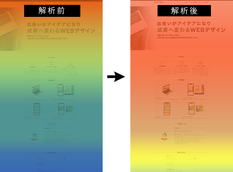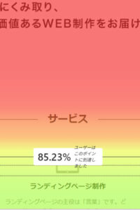ページの上部は暖色になりやすく、ページの下部にいくほど寒色になる傾向があります。色が急に寒色になる地点が離脱ポイントのため、料金やお問い合わせボタンといった重要な内容の配置を見直すことができます。